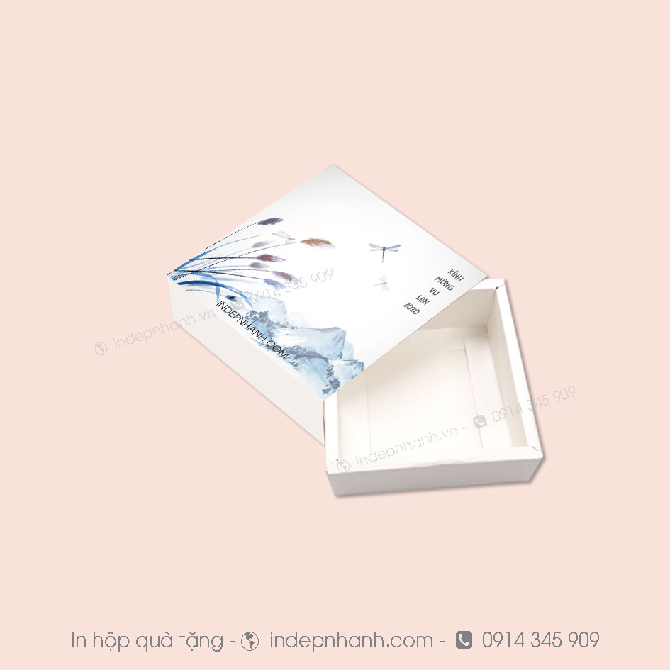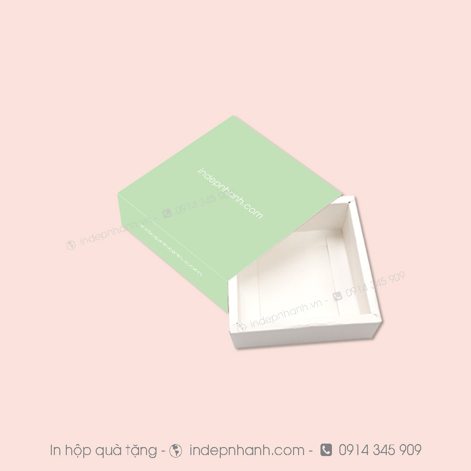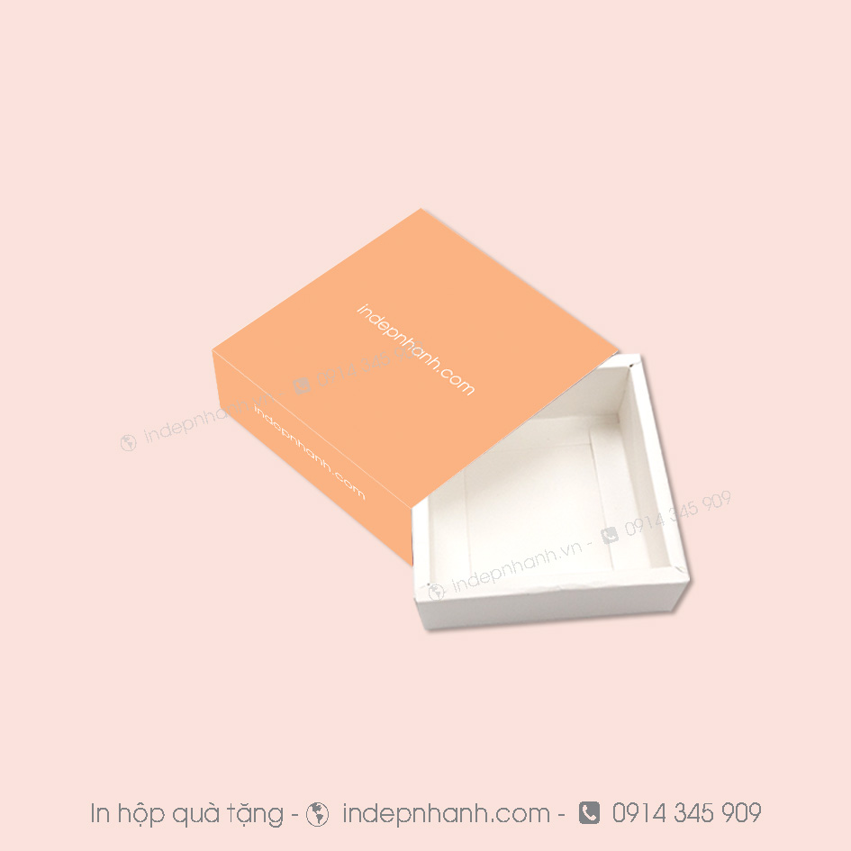 - Chất liệu: làm bằng giấy Ivory 350 gsm - riêng phần nắp kéo có phủ thêm lớp màng mờ (hoặc bóng) theo yêu cầu.