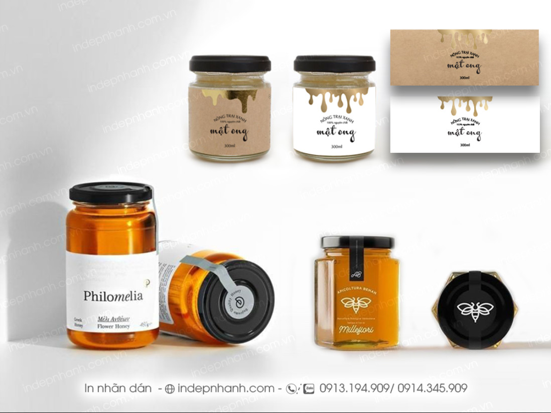 * Sử dụng chất liệu decal trong suốt khi Bạn muốn người sử dụng thấy rõ sản phẩm mật ong sánh vàng đẹp trong hũ, chai lọ như thế nào, thúc đẩy mua hàng từ người tiêu dùng.