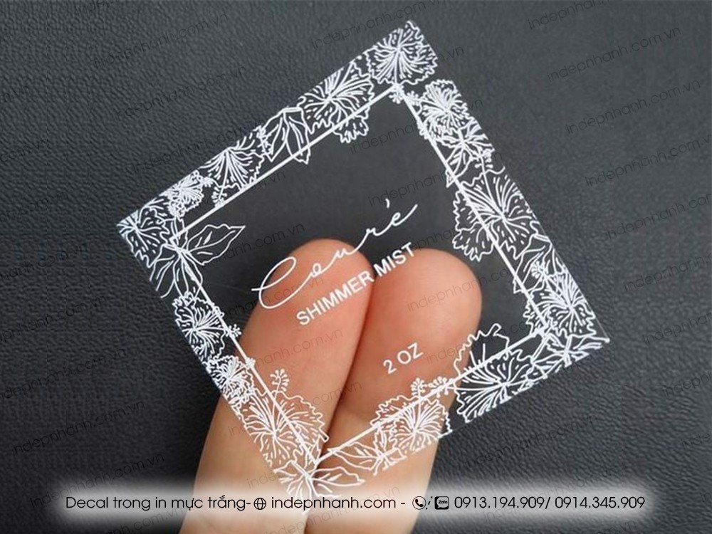 In decal trong màu đen giá rẻ nhất, in tem nhãn với decal in màu sẽ làm sản phẩm hấp dẫn, in decal trong suốt với mực trắng làm sản phẩm đơn giản nhưng nổi bật và nền nã, riêng ép kim trên decal trong suốt sẽ làm sản phẩm nổi bật và thu hút sự chú ý của tất cả mọi người.