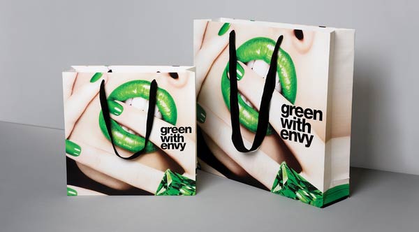 Một thiết kế túi giấy rất phong cách và đậm chất nghệ thuật cho cửa hàng thời trang Green with Envy. Đây là mẫu túi giấy được thiết kế bởi Paper Stone Scissors.