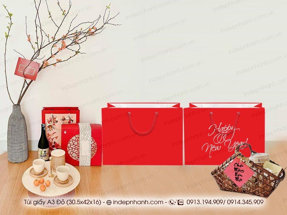 Nếu cần túi giấy lớn đại A3 màu đỏ cực đẹp, Bạn bấm vào hình bên dưới để tham khảo. Có 2 loại túi có chữ & loại không chữ