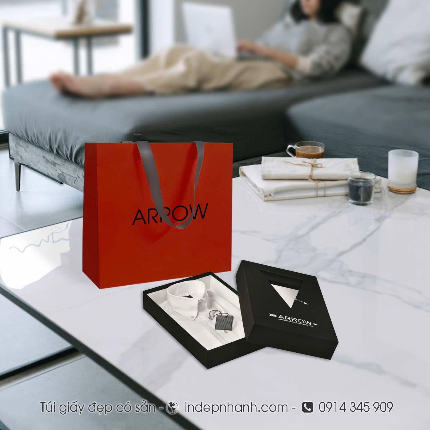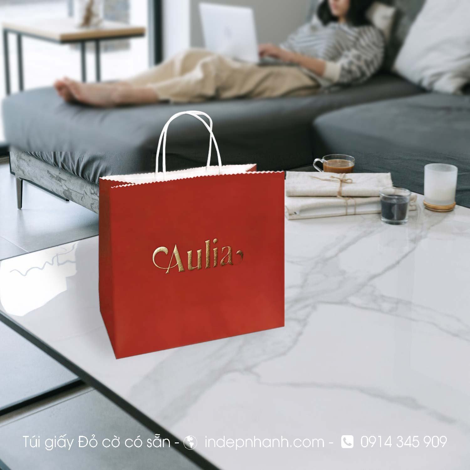 * Túi giấy có sẵn màu đỏ chưa in với quai trắng hoặc sử dụng dây ruy băng sang trọng