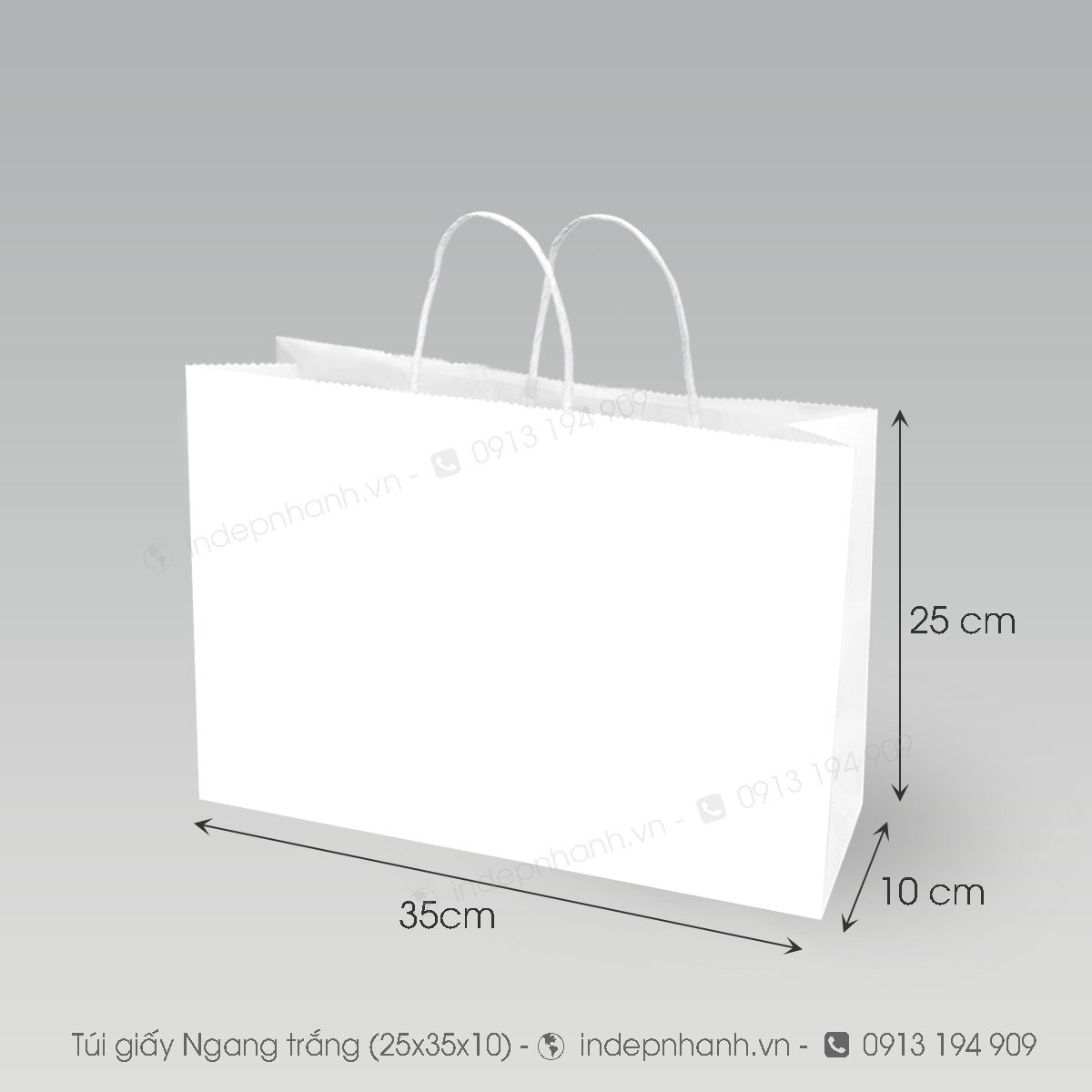 Túi giấy kraft trắng ngang có sẵn chưa in với quai túi màu đen, có thể thay quai màu trắng, xanh & đỏ