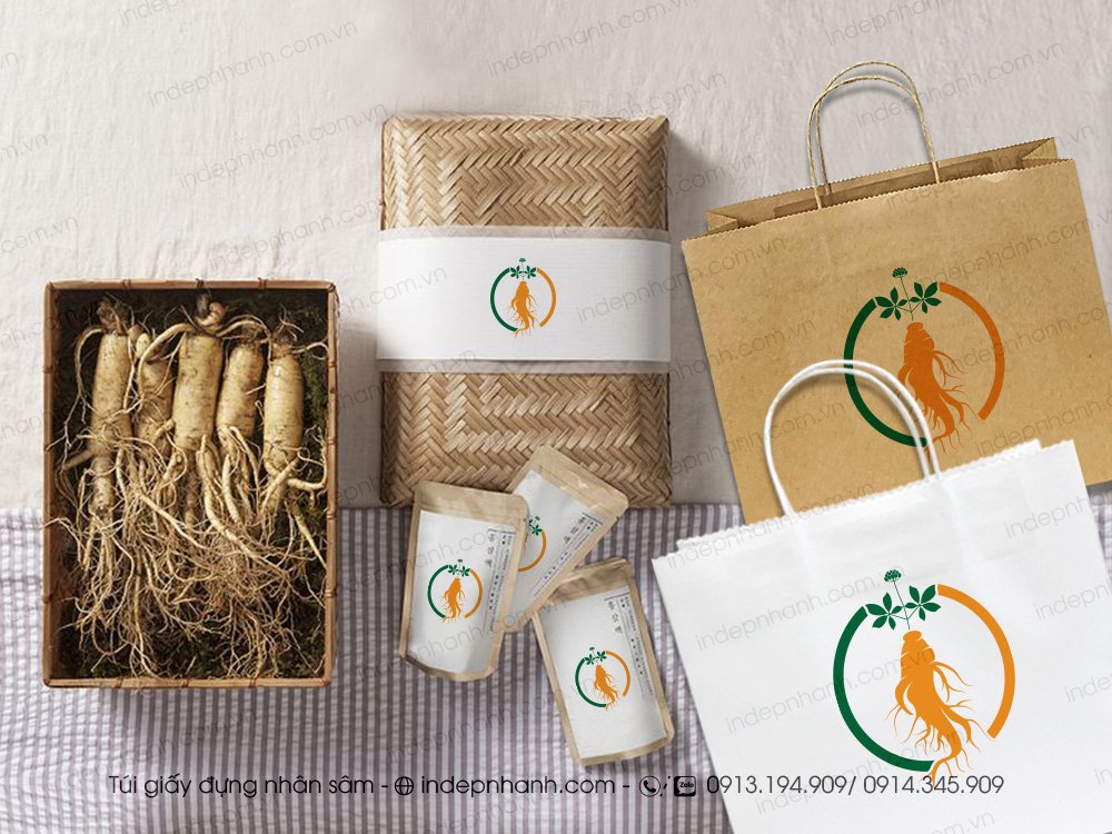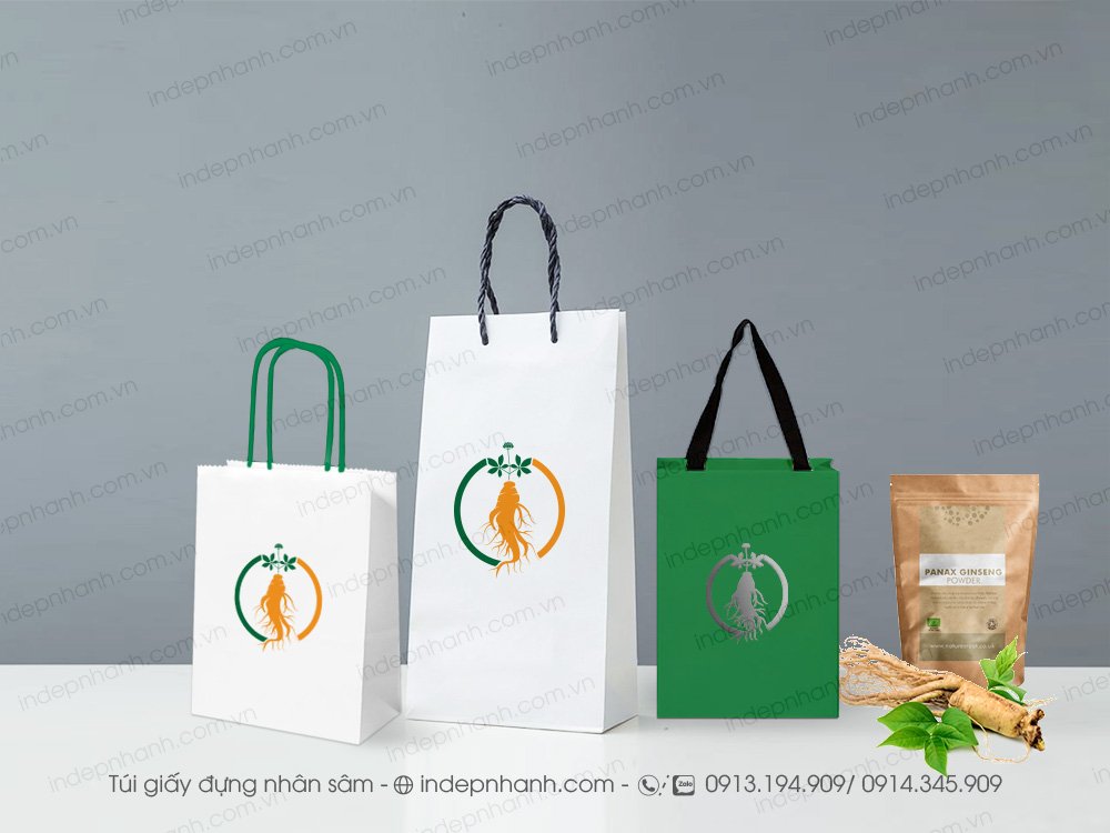 Có nhiều mẫu túi giấy đựng sâm cao cấp, ngoài chọn chất liệu giấy đẹp, các công đoạn thành phẩm sau khi in cũng rất quan trọng: như ép kim, dập nổi hoặc dây cầm đặc biệt cũng là điểm nhấn để túi đẹp hơn sau phần thiết kế ấn tượng.