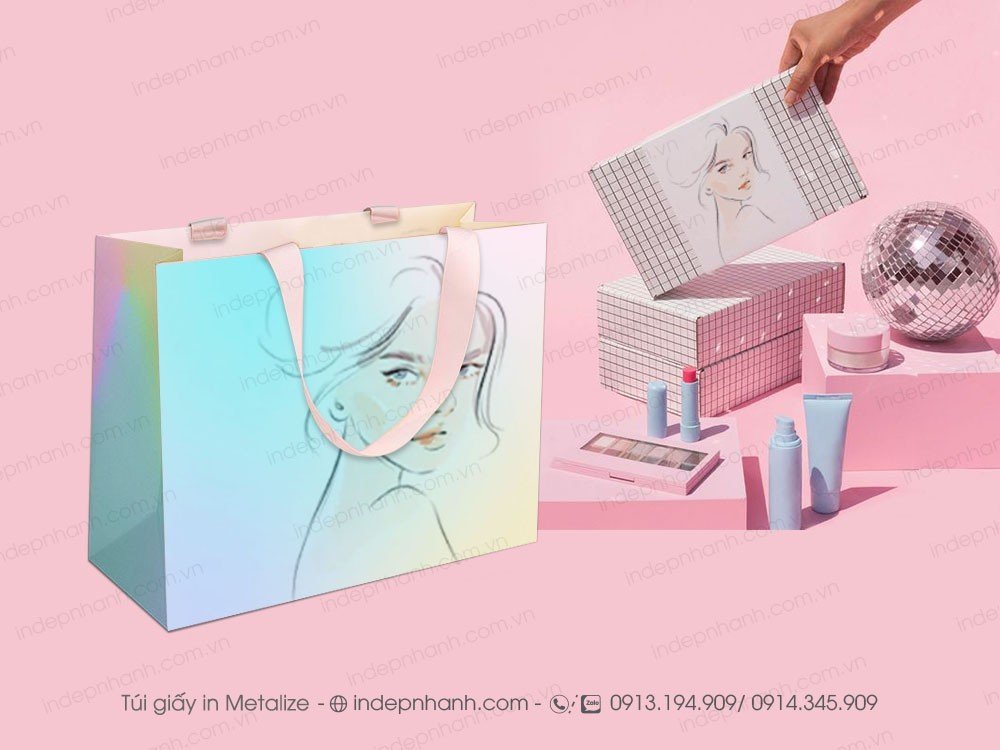 Tại Indepnhanh, chúng tôi nhận in túi giấy metalize cao cấp, ngoài cách thiết kế, in ấn thì chúng tôi chú trong nhiều đến khâu thành phẩm để sản phẩm thêm nổi bật. Dây ruy băng được dán sau là minh chứng rõ ràng nhất.
