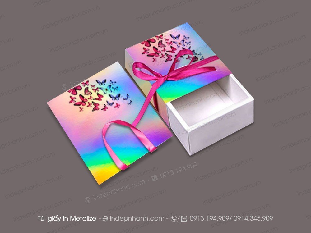 Metalize là gì? là lớp màng kim loại cực mỏng, có thể là nhôm, nike hay crom.. với từng góc nhìn, từng độ sáng khác nhau mà phản chiếu màu sắc khác nhau. Sản phẩm dùng màng metalize làm tăng giá trị thẩm mỹ & hiệu quả quảng cáo giới thiệu sản phẩm.