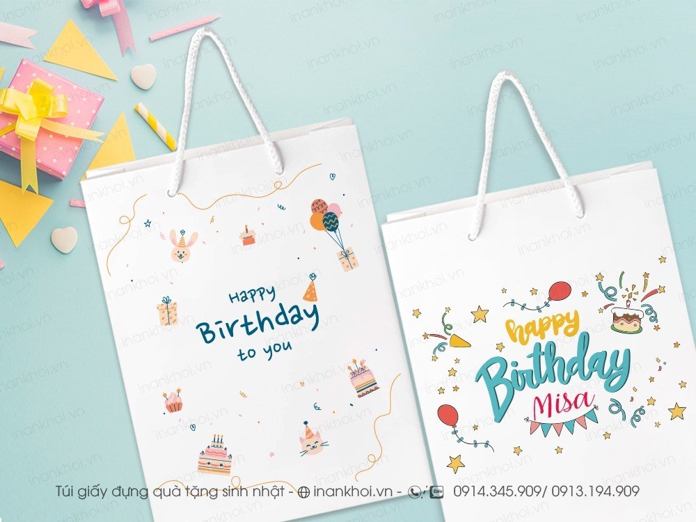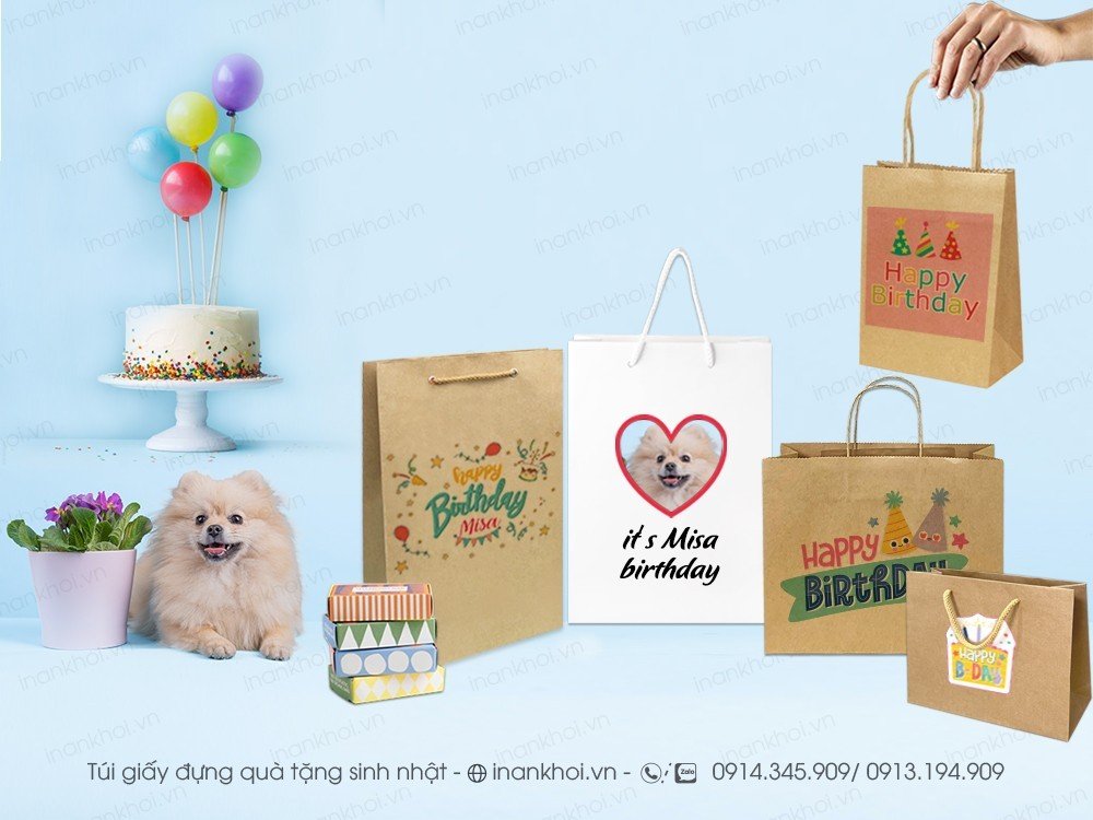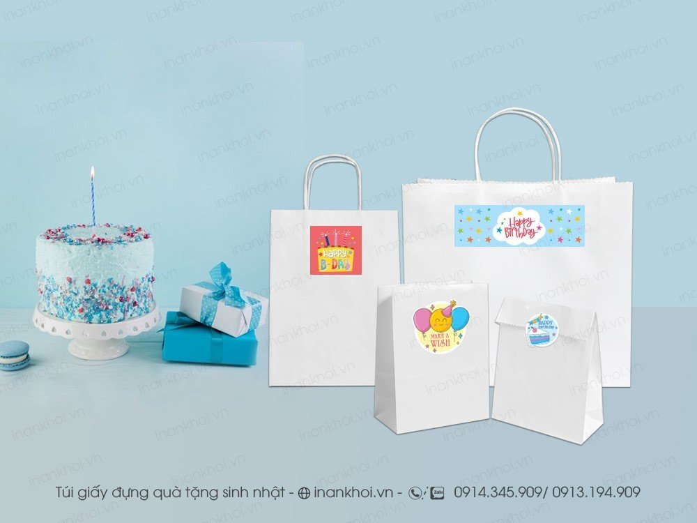 Có nhiều mẫu túi giấy sinh nhật cho công ty và túi giấy doanh nghiệp, chúng tôi sẽ tư vấn chất liệu, loại dây túi, hiệu ứng đặc biệt và cách in phù hợp nhất.