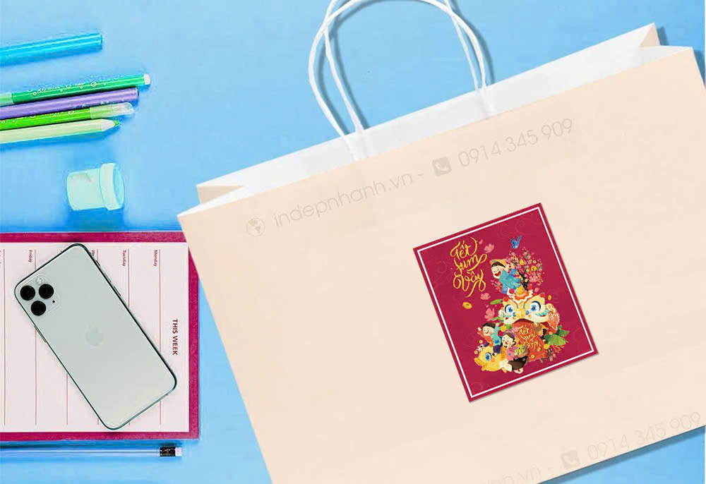 Túi giấy Tết sang trọng với các nhãn dán đặc trưng riêng. Chúng tôi có nhiều túi giấy trơn màu sắc đa dạng để Bạn chọn, có thể in decal dán lên với chi phí tốt nhất. Chúng tôi cũng có tặng một số nhãn có sẵn để Bạn dán vào tùy thích.Bấm vào đây để chọn túi giấy có sẵn